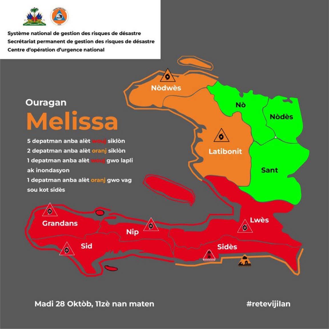 Port-au-Prince, le 28 octobre 2025 – Actuellement, l'ouragan MELISSA se trouve à environ 60 kilomètres de la Jamaïque et se déplace à une vitesse de 13 km/h dans une direction nord-nord-est. Les autorités locales, à travers la Direction Générale de la Protection Civile (DGPC) et le Système National de Gestion des Risques de Désastres (SNGRD), ont activé l'alerte pour plusieurs départements du pays, notamment le Sud, les Grand'Anse, les Nippes et l'ouest, en raison de l'intensification des conditions météorologiques.