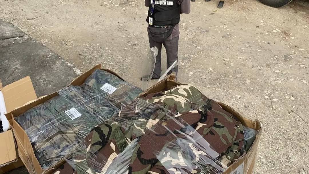 Port-au-Prince, 8 octobre 2025 — Parmi les objets confisqués figurent plusieurs paires de bottes, des uniformes tactiques similaires à des tenues militaires, ainsi que des dispositifs électroniques de guidage anti-drones.